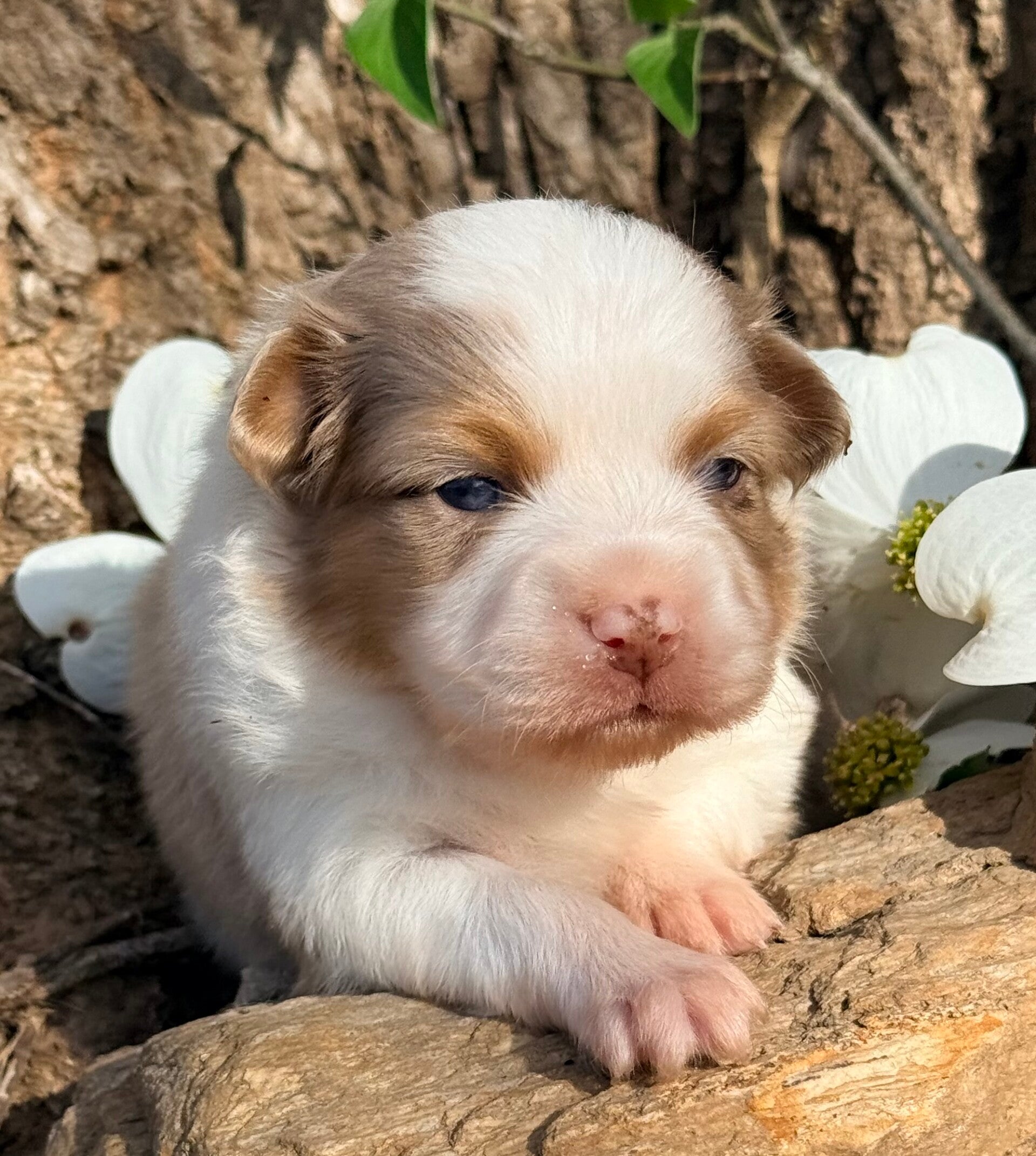 Freckles and Mister welcomed a beautiful litter of four puppies on .... MARCH 02, 2026 Two Merle Females. Two Black Tri Males. Blue Eyes on every baby. This is a repeat cross, last pairing produced puppies 10-11.5" Our girl "Sugi" aka Rustic Rose Sugar Time is from this last pairing. Freckles is 12.5" and weighs 16lbs.