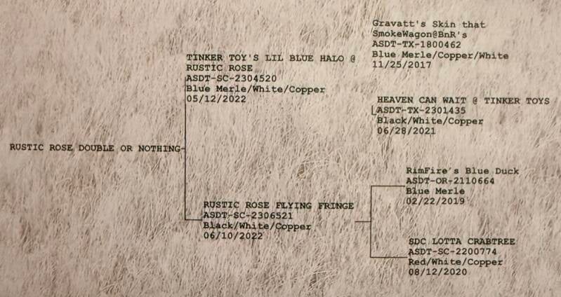 RimFire's Blue Duck aka "Duck" 11.5" tall 14lbs he is the sire of "Bee" aka Rustic Rose Doing It Right and Flying Fringe "Fly" ( Bee's Sister ), Spur aka Rustic Rose Fancy Lil Garcia's, and Patsy Rustic Rose Patsy Montana. Grandsire to Rustic Rose Misty Blue and Rustic Rose Double Day Cowgirl aka Double.
